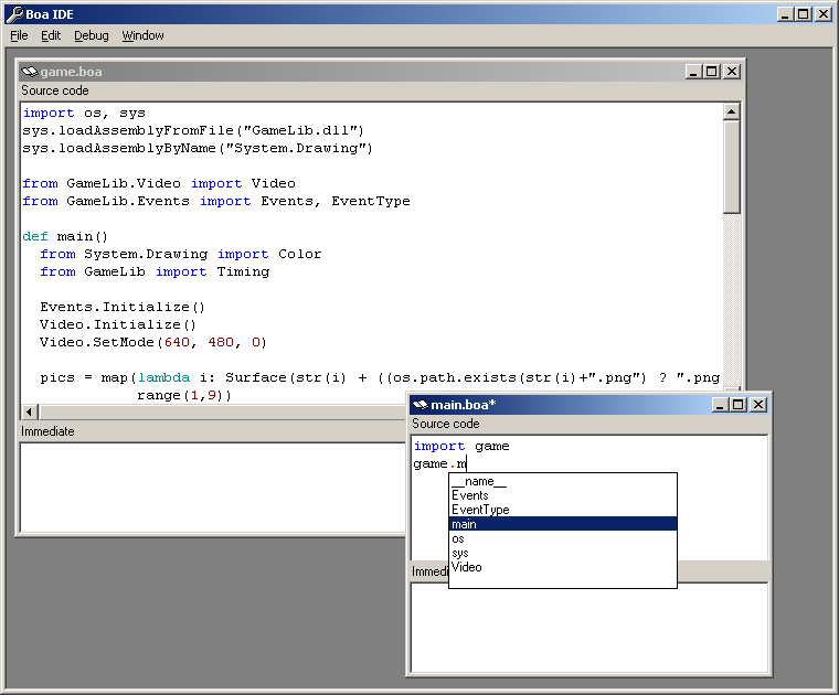 At least, it did, until the development of the IDE. Since that point, strict compatibility with Python has become a lower priority, as it seems better to simply make the language as good as possible. At this point, I'm not sure whether I should continue striving for Python compliance, or just branch off and make all the changes to Boa that I feel would be worthwhile. I added a few additional constructs, such as named blocks and jumps, a ternary operator, and some constructs to aid writing .NET code, such as C#-style lock and using statements. Boa also has "real" closures, whereas Python has simplified, read-only closures.