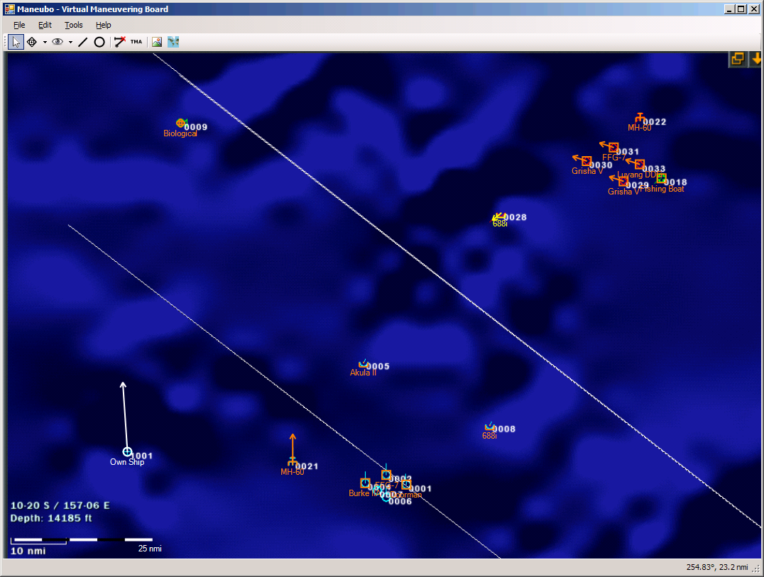 Maneubo is a program that was originally intended to provide a kind of virtual maneuvering board. A maneuvering board is a specialized chart used to plot the motions of craft, compute intercept and avoidance courses, etc. Maneubo does not provide a true maneuvering board, and in fact I consider them to be more or less obsolete, but Maneubo dispenses with the chart and automates the calculations, allowing you to do the same kinds of things much more conveniently.
