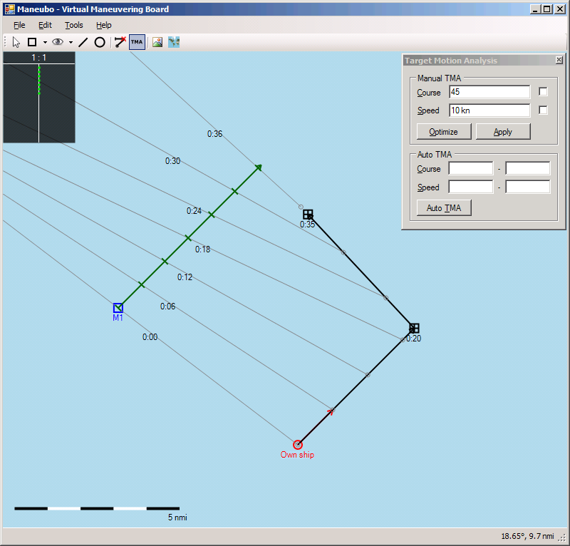 - Target Motion Analysis (TMA) - Observations of units can be analyzed to infer a target's position, speed, and course. This can be done manually, with an intuitive user interface, or automatically by Maneubo.