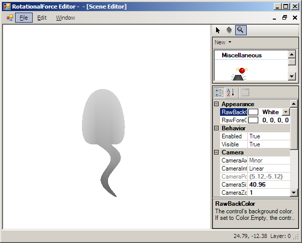 Not bad, but it could be better. It doesn't look so good against this black background, so let's change the background color to white. Select the view tool (the third tool, the one that looks like a magnifying glass), and change the RawBackgroundColor property to "White".