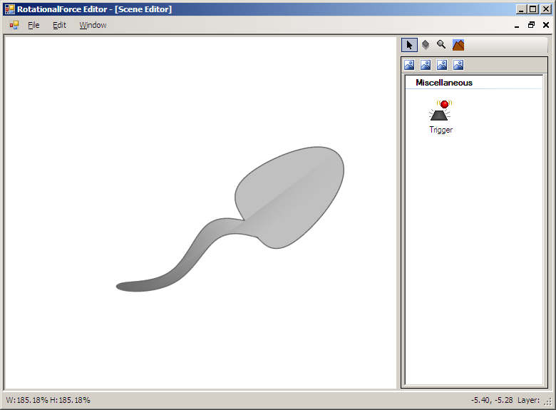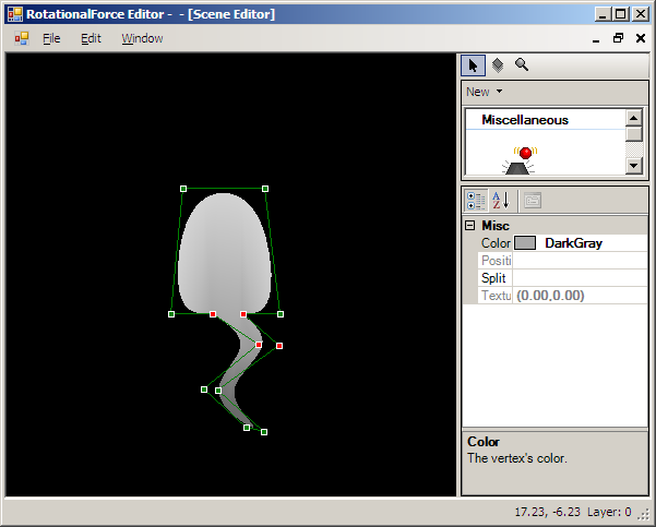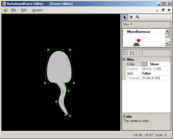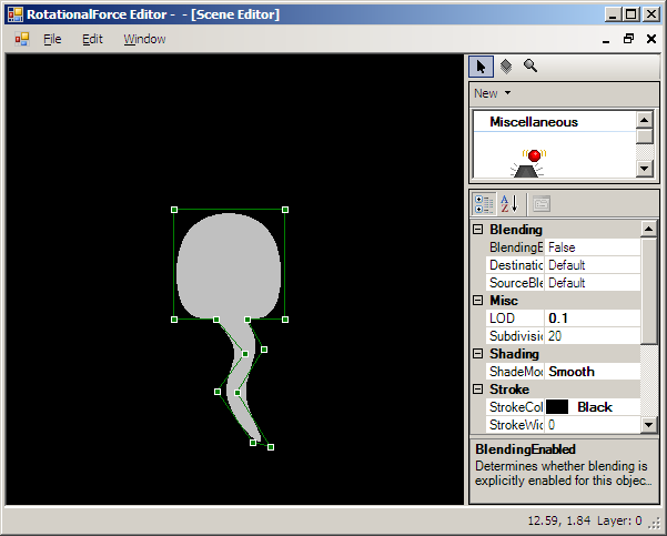 Switch back to the object tool and select the object. You'll notice that you get a series of blue boxes around the object. This is because the object tool defaults to the object submode, which edits the object as a whole. We want to edit the object's shape, so middle-click on the object to switch back into vector mode. Now there's not enough contrast near the top. We can fix that by giving spermie a border. In the polygon properties on the right, set the StrokeColor to "DimGray" and the StrokeWidth to 2. 1.5 also looks nice. Getting better, but the edges are ever-so-slightly jagged. Double-click the BlendingEnabled property to change it to true. This will anti-alias the object border.