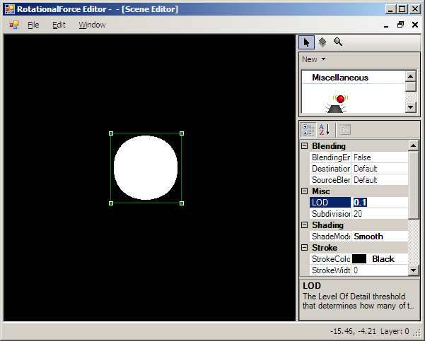 - Added support for freehand polygons. Just right-click and choose "New freehand shape". Note that the resulting shape is not meant to be used directly because it will have too many points. Also, points that cause the polygon to become self-intersecting are not removed. So after creating a freehand shape, fix up any small loops that cause the polygon to self-intersect. Then tweak the LOD until it looks reasonably good. Finally, convert the polygon to a pre-subdivided polygon (from the right-click menu) and tweak the resulting points to get the final shape. Make sure to zoom in and check any sharp corners to ensure that there aren't many points packed into a small space. It may be useful to iterate this process, increasing the LOD value each time.