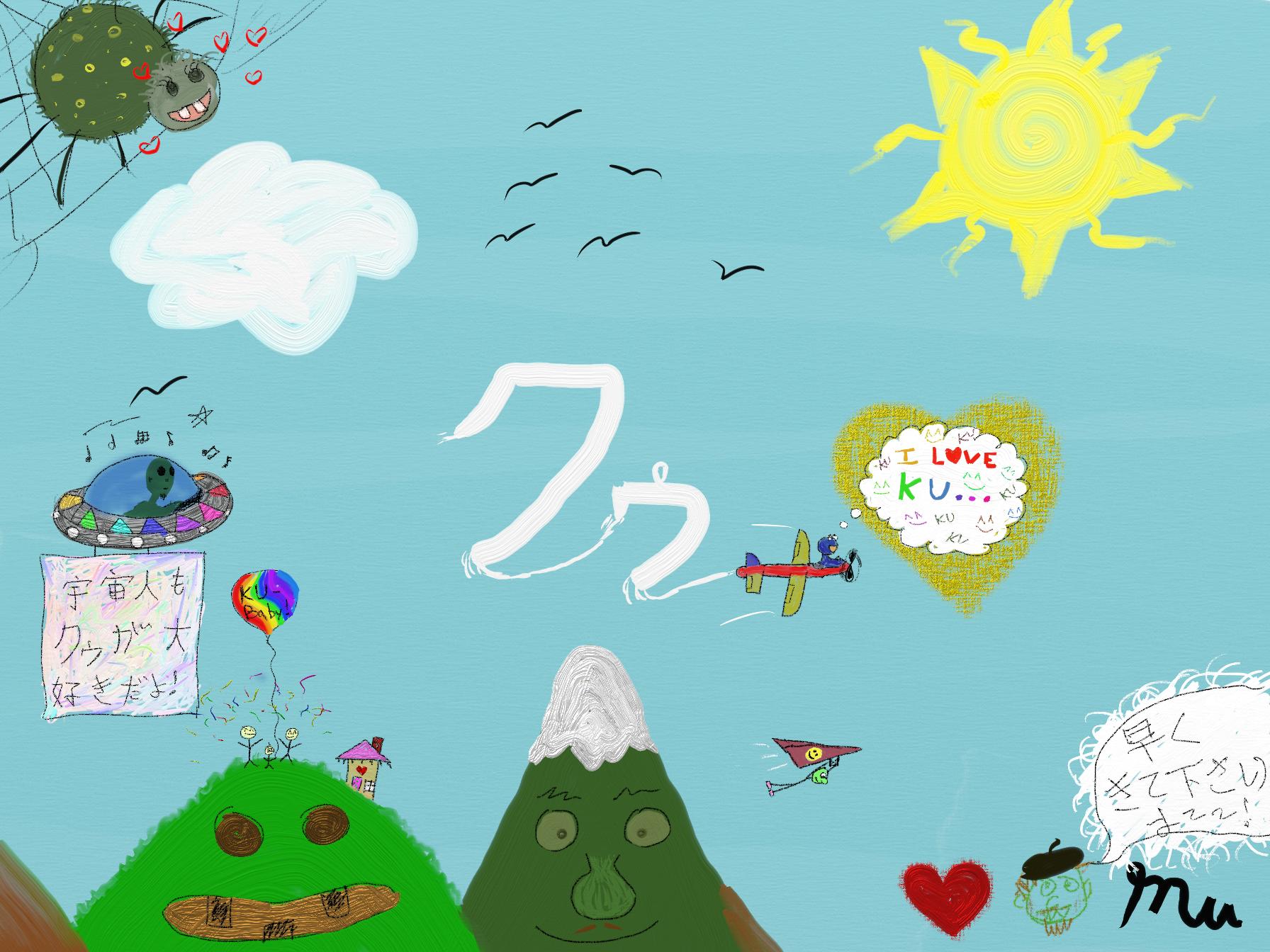 A cute picture I made for my girlfriend's sister. The skywriting says "Ku!". The alien sign says