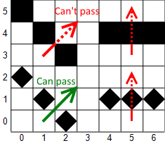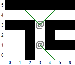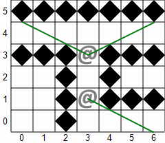 Pros & cons: Same as the permissive field of view algorithm.The digital field of view algorithm treats every tile as a diamond (embedded in the square, the remainder being empty space) and considers a tile visible if there is an unobstructed line from any part of the player's diamond to any part of the target diamond. As a result, it's slightly more permissive than even the permissive field of view algorithm (since walls present less of an obstruction), but otherwise it shares all the same features and drawbacks while being even slower. The idea is based on the rather unwieldy concept of digital straight line segments, and I did not bother to create an implementation of it. One interesting feature of the algorithm is that the knowledge of the digital line segment from a line-of-sight calculation allows easy tracing of a projectile path through space without hitting any walls, even down somewhat twisted tunnels (such as the Kuo corridor above). But the complexity seems to outweight the benefit.