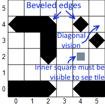 I've been considering the different interpretations of when a tile is visible, and I'm not sure if on/off is really the best way to go. If we're talking about a wall, or something that's too large to squeeze between 2 diagonal NetHack boulders, that should definitely be visible; ditto the floor terrain. If essentially all of the tile is visible (too little room not visible to fit the smallest scale monster). In-between, it really should be able to depend on how sneaky (and small) the thing in the tile is, versus the perception and time spent of the observer. (For something like a chest, the inner square you use should work well.) Your thoughts?