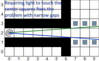 The problem with light passage through narrow spaces is illustrated in the second image above. No matter how far you are down the tunnel, the circular sector will open up as it leaves the narrow space and, with other algorithms, immediately illuminate the tiles above and below. As seen in the screenshots above, pillars cannot stop this illumination. The reason is that, like the walls of the tunnel, the sector is still opening up after it passes between the pillars. Not illuminating tiles only barely touched by light avoids this, and allows pillars to effectively stop the light. This should also reduce shadow gaps by preventing small slivers of light from dispelling the shadow from a tile.
