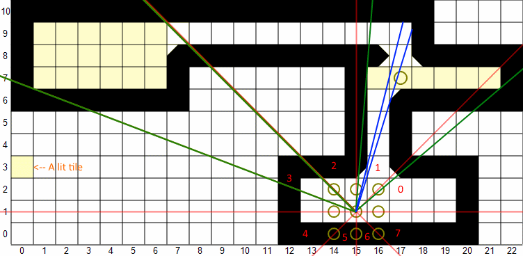 However, my use of it for lighting poses one problem which I don't think has been covered in the article or discussions, and that is that (I believe) this algorithm visits tiles on the octant borders twice. That isn't a problem when the "SetVisible" function sets some kind of data (visible=true), but e.g. when doing lighting you want to update data, like adding one light's contribution to the tile's total lighting data. Thus tiles along octant boundaries appear brighter than others.