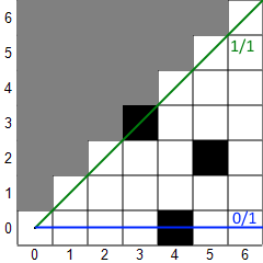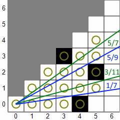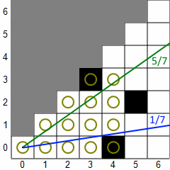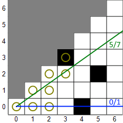 In the usual implementation, shadow casting renders a tile visible if there is an unobstructed line from the center of the player's tile to any part of the target tile. Here's an example to illustrate how shadow casting works for a single octant. (Not all implementations work in octants.) In the first picture, a 45-degree sector of light is projected down the 45-degree octant. The green line bounds the top of the sector and the blue line bounds the bottom. The fractions displayed are the slopes of the lines, which are always from 0 to 1 (inclusive). Tiles with circles are considered visible. Then, the algorithm works from left to right (increasing X). For each column, it scans from the top tile within the sector down to the bottom tile within the sector. If a transition from clear to opaque or vice versa is found, the sector is adjusted. In the second picture, the first three columns have been scanned and a transition from opaque to clear has been found in the fourth column, so the top vector is adjusted downward. In the next picture, a clear-to-opaque transition has been found and the bottom vector is adjusted upward. In the final picture, you can see that both types of transitions were found in the fifth column, so the sector splits into two sectors, each of which continue independently. The algorithm stops when it hits the maximum sight distance or all the sectors become empty (bottom slope > top slope).