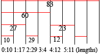 The first data structure that popped into my mind was the simplest one -- an array, indexed by line number, storing the starting indices of the lines. The length of a line could be calculated by taking the difference between neighboring starting indices. With this array implementation, adding a new line to the end of the array and converting from line number to starting index are O(1) operations, but everything else is O(N). I quickly realized that it might be improved by storing the length of each line rather than the starting index of each line. Doing so means that changing the length of a line -- obviously a very common operation in a text editor -- becomes O(1), while converting a line number to its starting index becomes O(N). The array implementation has the benefit of being very simple, and I suspect many text editors use it.