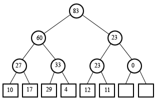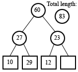 Given this revelation, I had an idea for how to query the data structure. Consider line number 3 (with zero-based counting). We know that the line has a length of 4. Here's how to calculate that from the tree. The line index 3, in binary, is 011. We start by positioning a node pointer to the leaf node nearest to the line we're looking up. The length of line 3 is not stored directly, but line 2 is, so we'll start there. We can simply mask off the LSB to get this index. In the tree above, you can see that line 2's length is 29. That's where the node pointer begins. We'll have a value that accumulates the length of the line, initialized to zero. If the LSB of the index is 1, we subtract the value stored at the node from the accumulator, shift the index to the right, move the node pointer up to the parent node, and repeat. If the LSB is 0, we add the value to the accumulator and the calculation is complete. Remember we have index 3, with binary representation 011. Since the LSB is 1, we subtract the current node value, 29, from the accumulator. The index is right-shifted, becoming 01, and the node pointer is moved to the parent, which stores the value 27. The LSB is still 1, so we subtract again. The accumulator becomes -56, the index becomes 0, and the node pointer moves to the node storing 60. The LSB is now equal to 0, and so we add 60 to the accumulator. -56 + 60 = 4, which is the length of the line. The offset of a line can be calculated very similarly, and simultaneously in fact. (You may notice a special case when retrieving the length of a line with an index that has all relevant bits set to 1, for instance the line at index 7 (binary 111) in a tree that can hold 8 lines. By the time the LSB of the index becomes zero, the node pointer has moved above the root of the tree. The elegant solution is to add a node above the root of the tree that stores the total length of the document (ie, a new root with only one child, which is the binary tree in the picture).