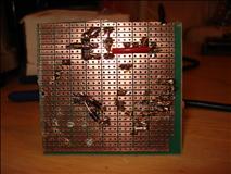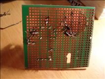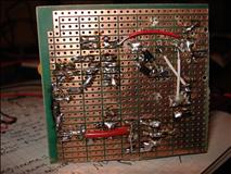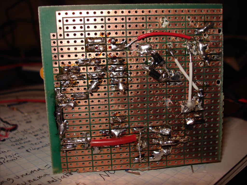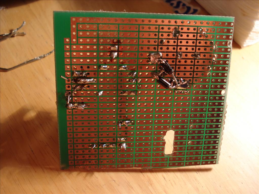 Before I could even begin construction, I had to get some tools so I could cut and drill the prototype board. That took two weeks. While I was waiting, I constructed the circuit on a breadboard, debugged the code, and charged my first battery pack. When I finally got the tools, I quickly noticed that the layout wouldn't quite work, due to jumper wires being trickier to place than I thought. (They don't like being overlapped.) Routing the ISP header became too complicated, so that feature never made it in. Here you can see an early stage with my highly professional construction techniques evident, and the first few parts soldered on. Most of the scratches are my poor-man's silkscreen, but some are just scratches. I used hot glue to hold some parts in place, especially those that would be manipulated or seemed potentially unstable.