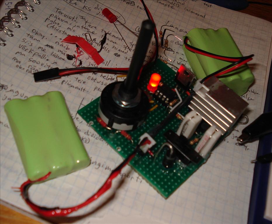 I wanted a battery charger that could charge the various NiMH battery packs that I have, ranging from 700 mAh to 2200 mAh and 1.2 V to 7.2 V, and be cheaper than the single-purpose chargers sold at the store. I got some general information about battery charging from http://www.mpoweruk.com/chargers.htm and more specific ideas for a charger from http://www.angelfire.com/electronic/hayles/charge1.html.