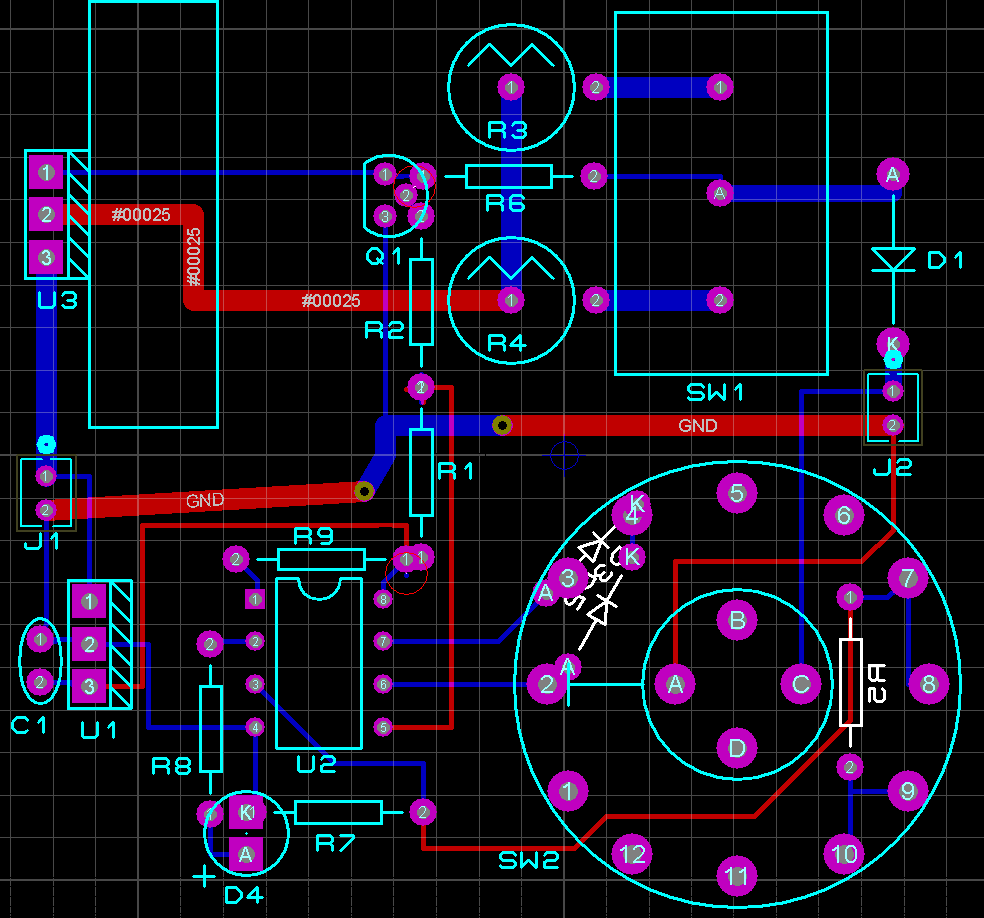 Unfortunately, ARES has no support for prototyping boards, so I created an overlay of the islands using the silkscreen layer in ARES, and just routed it as though it was a PCB. I didn't actually plan to use vias or solder-side wiring in the real thing, with the exception of R5, D2, and D3 (behind the rotary switch), and I expected that the jumper wires would take slightly different paths than the traces shown in the layout.