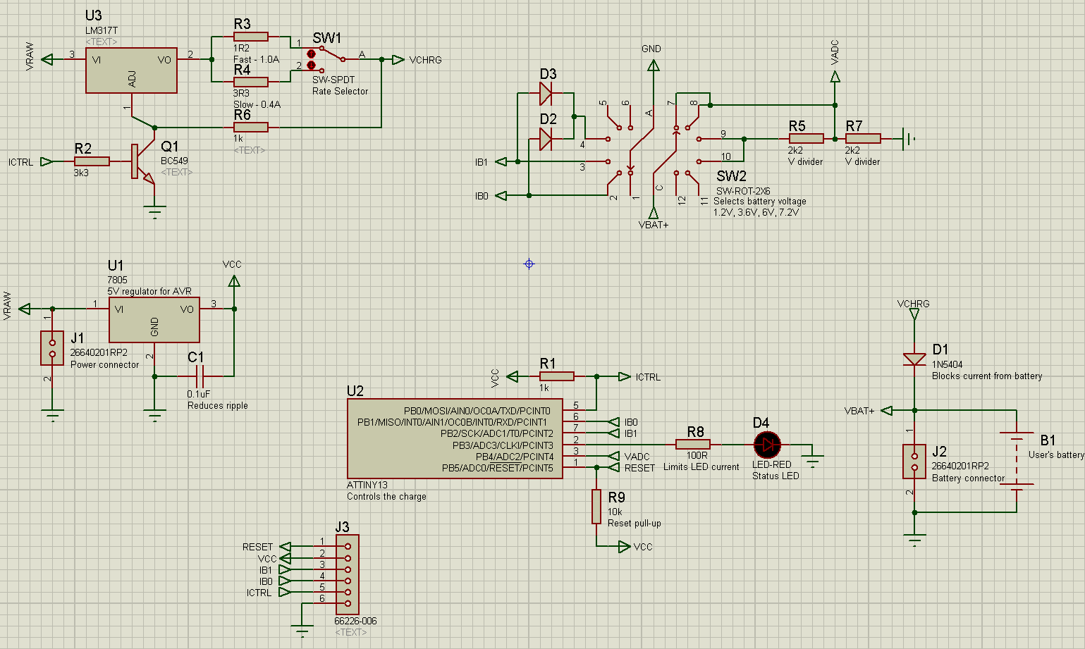 The basic idea for my circuit comes largely from that described on the page above, but I omitted the bridge rectifier and filter capacitor, since I'd rather have a reusable external power supply than build the power supply into the charger, and because I expect my power supply to provide DC rather than AC. I replaced the PIC16C711 and crystal oscillator with an ATtiny13A microcontroller. I added switches to control the charge rate and voltage divider, and to tell the microcontroller what kind of battery pack is being charged, and since I didn't have enough I/O ports available after adding the switches, I used only a single status LED. Finally, I added a 6-pin header for in-system programming.